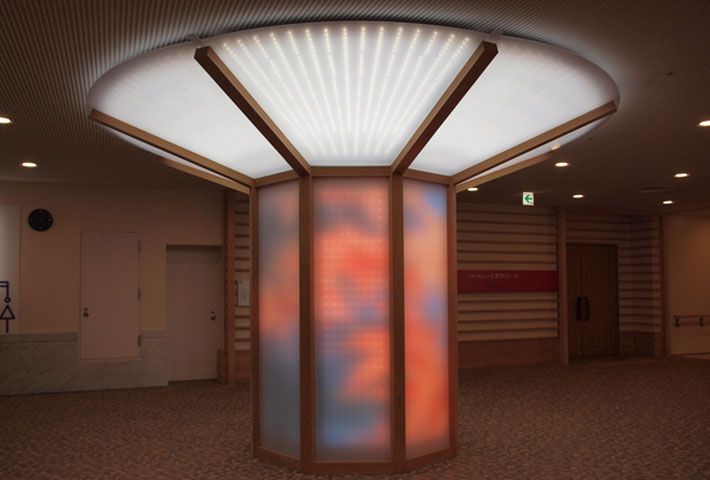 フロア構造柱に日亜化学工業(株)製フルカラーLEDユニットを配置し、 前面をフロストガラスで覆いまぶしさを低減。 徳島の豊かな自然を柔らかな光で表現したLEDフロア照明です。 天井の円形部も日亜化学工業(株)の白色LEDユニットを使用。